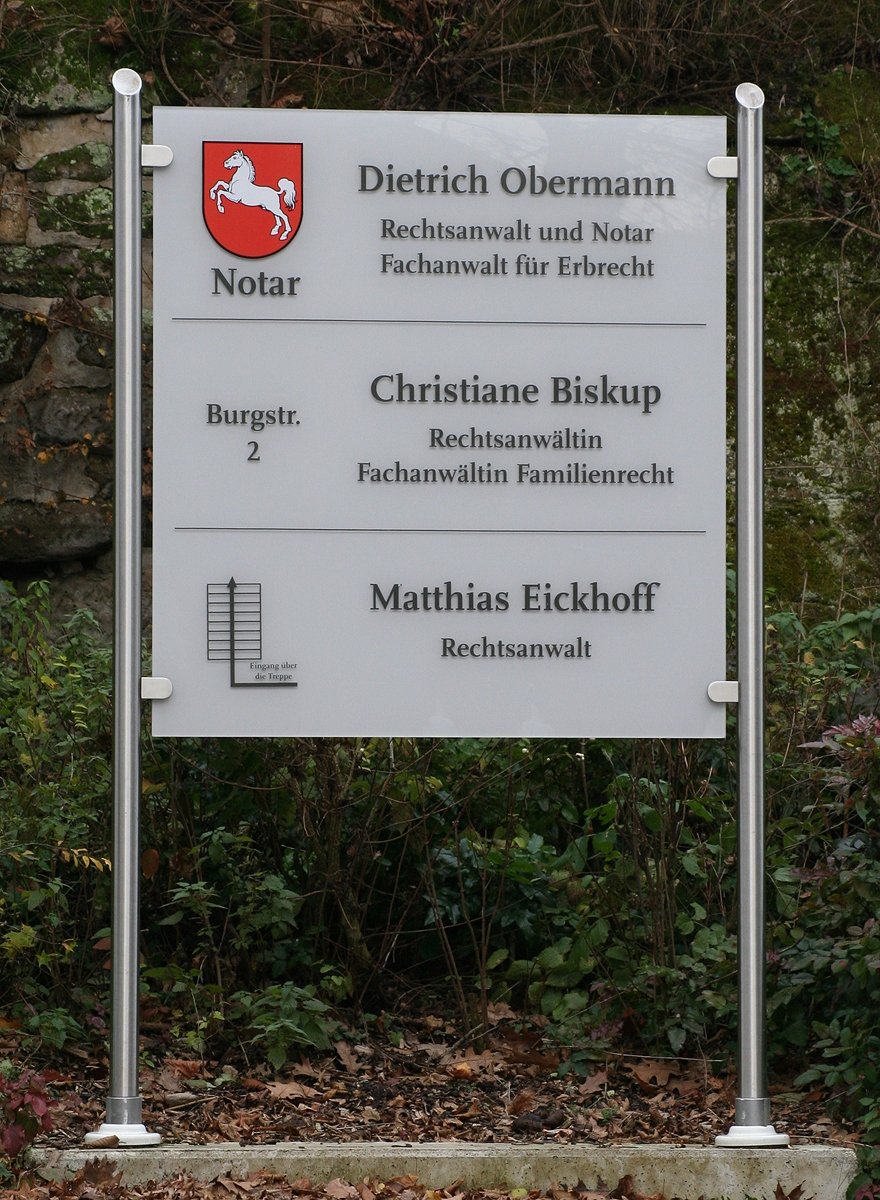 Werbe- und Hinweisschilder Firmen-Kanzlei-Praxisschilder – Werbeanlagen Ihr Firmenschild ist ein wichtiges Informations- und Kommunikationsmittel. Artikel von der Stange werden Sie hier vergeblich suchen.